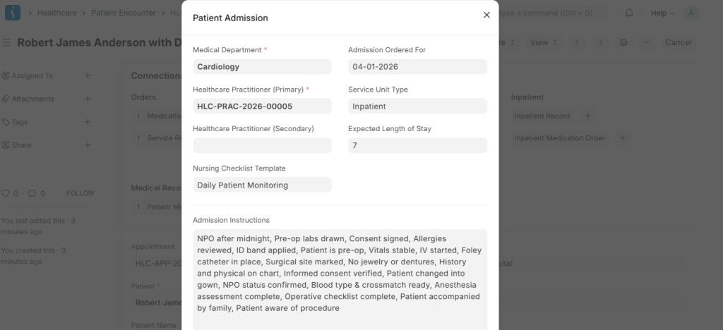 Inpatient Record: The Inpatient Record is created when a patient is admitted to the hospital (IPD). It contains details such as the patient information, admission date, assigned room or bed, healthcare practitioner, and treatment plan. This record helps track the patient’s hospital stay until discharge.
