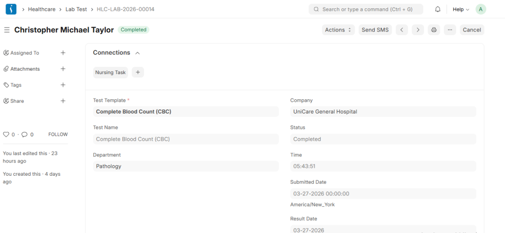 Lab Test: A Lab Test is created when a doctor requests a diagnostic test for a patient, such as blood tests, urine tests, or imaging-related laboratory analysis. It records the test type, patient details, and observations. After the laboratory technician performs the test, the results are entered into the system and used by doctors for diagnosis and treatment.
