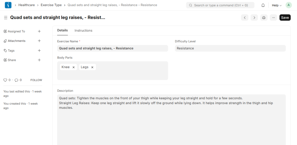 Exercise Type: Exercise Type lists the different exercises used during physiotherapy sessions, such as stretching, strengthening exercises, balance training, or mobility exercises.